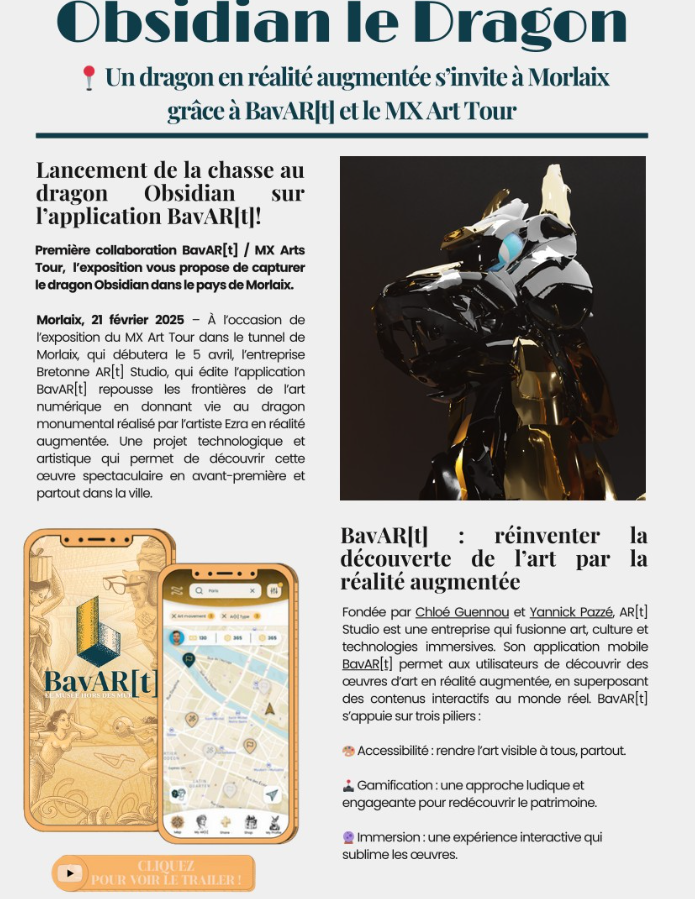 Pour ceux qui ne peuvent pas descendre dans le tunnel, nous avons créé le jumeau numérique d’Obsidian. Grâce à l’application BavartApp, il est possible de découvrir ce dragon en réalité augmentée sur le parvis de la gare de Morlaix et dans cinq autres lieux culturels de la ville. Cette expérience permet de voir l’œuvre sous toutes ses coutures et de vivre l’exposition librement, en extérieur.
